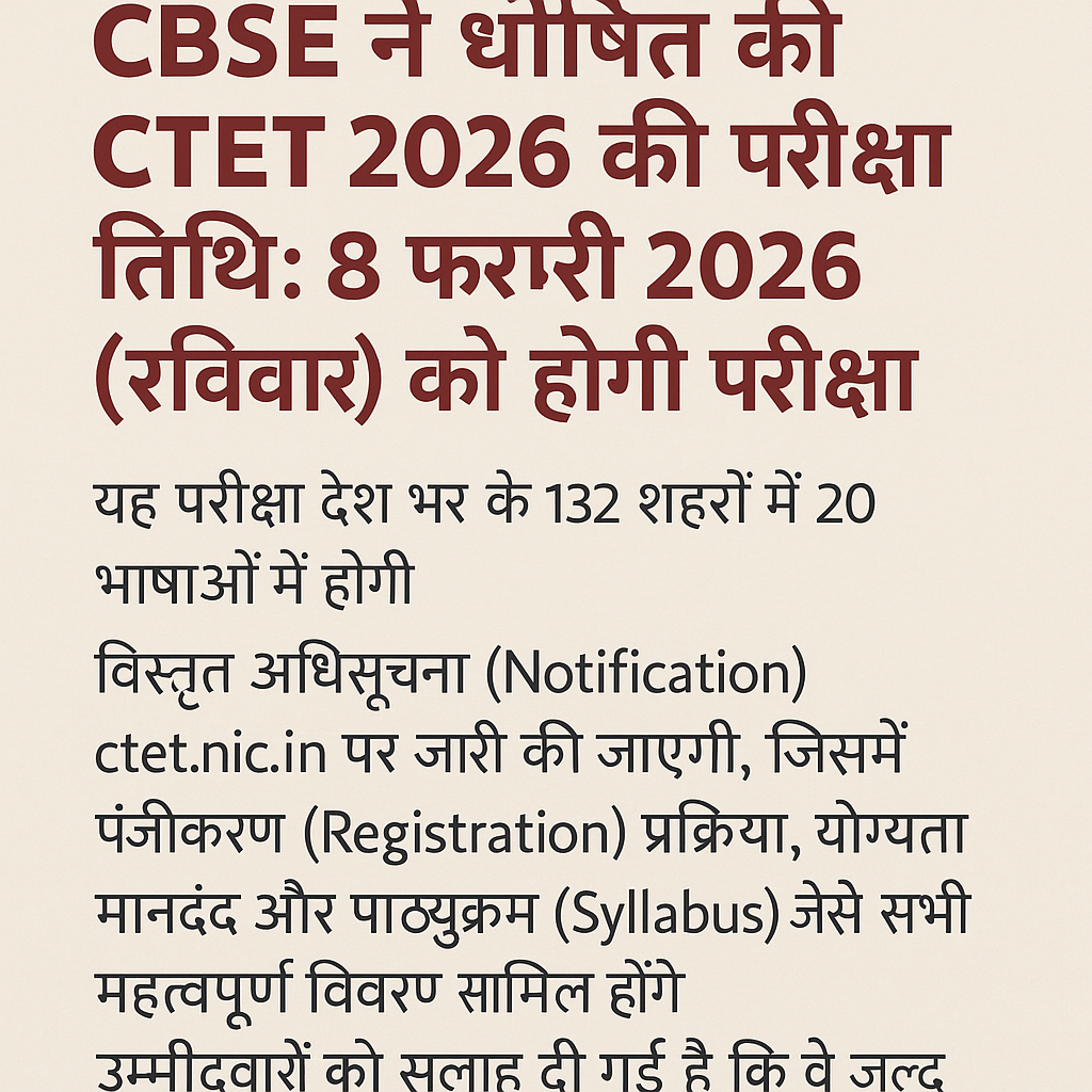 CBSE ने घोषित की CTET 2026 परीक्षा तिथि | 8 फरवरी 2026 को होगी परीक्षा | जानें आवेदन प्रक्रिया, सिलेबस और योग्यता CBSE ने CTET 2026 परीक्षा की तिथि जारी कर दी है। अगली CTET परीक्षा 8 फरवरी 2026 (रविवार) को देशभर के 132 शहरों में आयोजित होगी। जानिए आवेदन प्रक्रिया, पात्रता मानदंड, परीक्षा … Read more